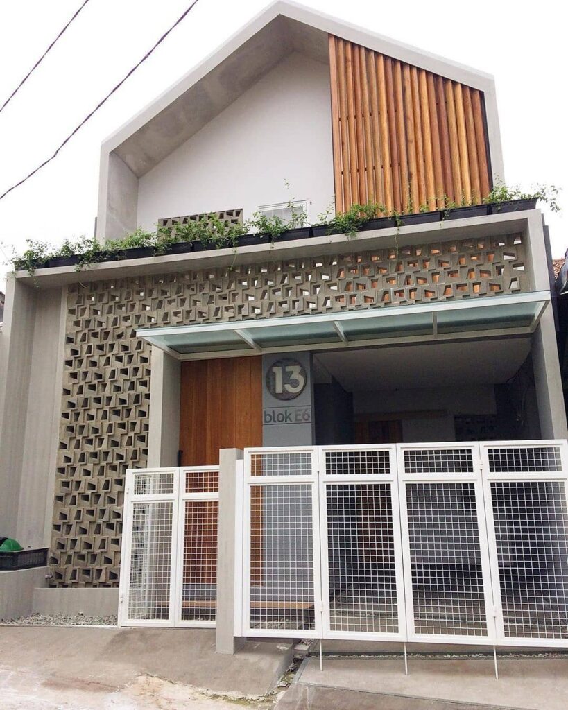 Satu lagi rumah minimalis kecil yang memiliki fasad sangat indah. Berbentuk layaknya konsep mezanine membuat rumah ini memberikan identitas yang sangat khas. Sehingga siapapun banyak yang akan terpesona dengan konsep fasad rumah ini. Anda bisa menggunakan kayu vertikal untuk memberikan efek tinggi pada rumah yang kecil.