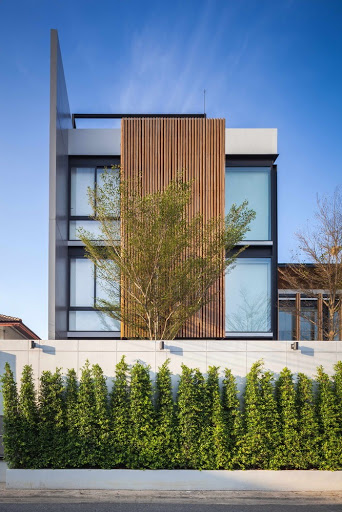 Menggunakan sebuah tanaman yang difungsikan sebagai sebuah pagar rumah membuat fasad satu ini menjadi lebih natural. Perpaduan warna hijau pada warna monokrom memang akan memberikan pengaruh yang indah dan menjadikan ruang eksterior lebih berwarna.