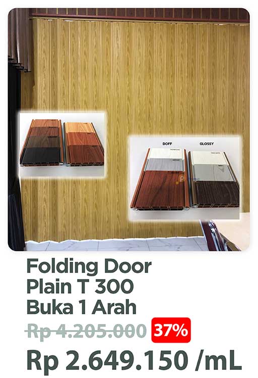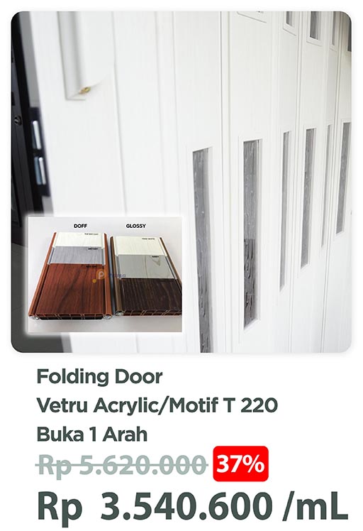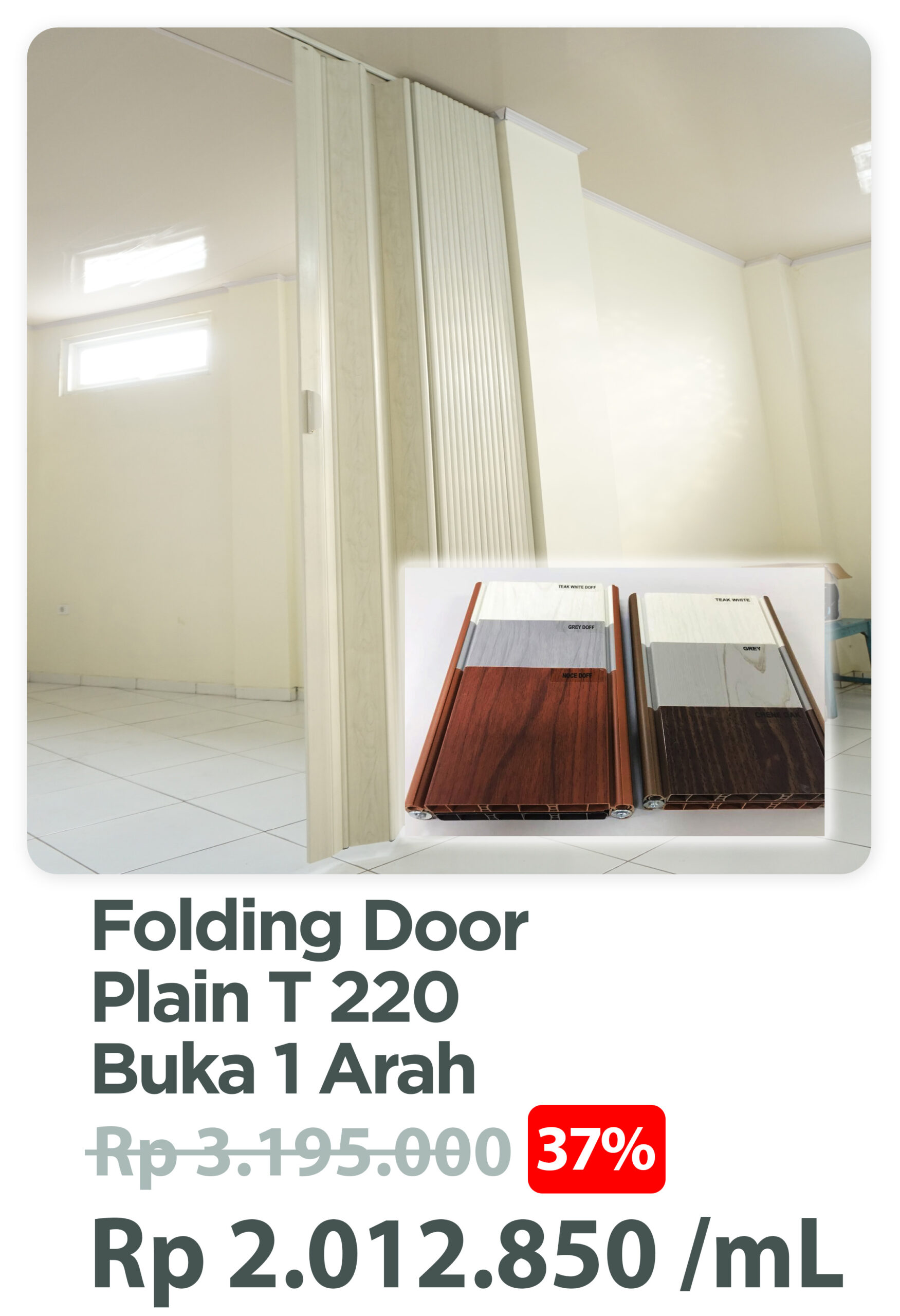 - Folding Door PVC: Pintu lipat PVC menawarkan fleksibilitas dalam desain dan warna. PVC adalah bahan yang tahan lama dan tahan terhadap cuaca ekstrem. Material PVC juga memiliki sifat tahan air, sehingga cocok untuk digunakan di kamar mandi atau dapur.