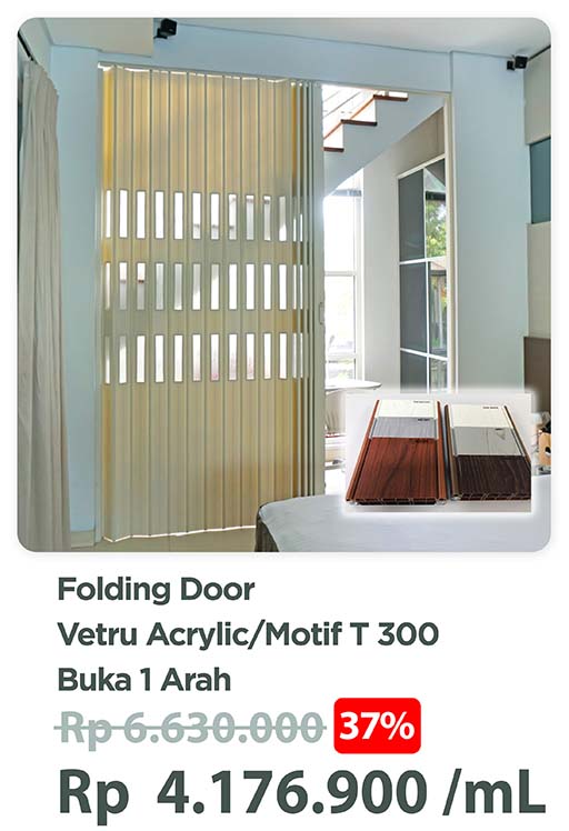 - Pilih Jenis dan Material Folding Door: Pilih jenis dan material folding door yang sesuai dengan kebutuhan dan preferensi Anda. Seperti PVC dengan kombinasi akrilic atau polos.