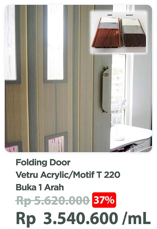 - Harga Folding Door PVC Acrilic: Jika Anda mencari opsi dengan fitur tambahan atau desain yang lebih eksklusif, harga untuk folding door PVC Semarang acrilic mungkin menjadi pertimbangan. Dengan kombinasi acrilic cahaya akan masuk sehingga ruangan terlihat terang dan meminimalkan penggunaan lampu.