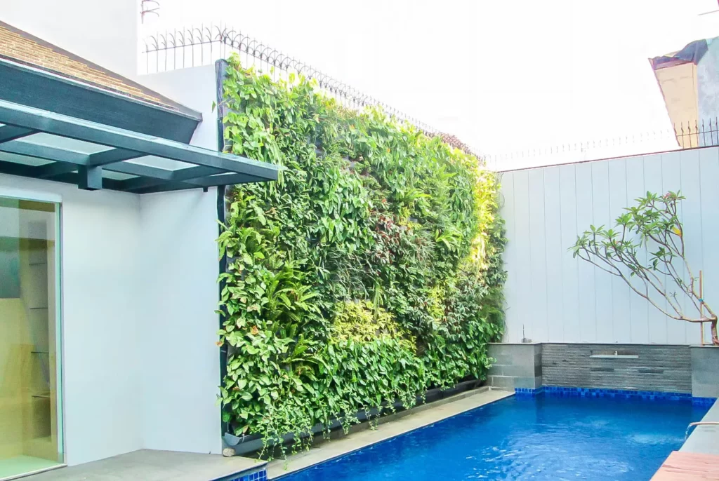 Tenang, taman vertikan tidak hanya dapat diaplikasikan di halaman rumah Anda. Konsep ini dapat di aplikasikan dengan sederhana dan minimalis di samping kolam renang Anda.