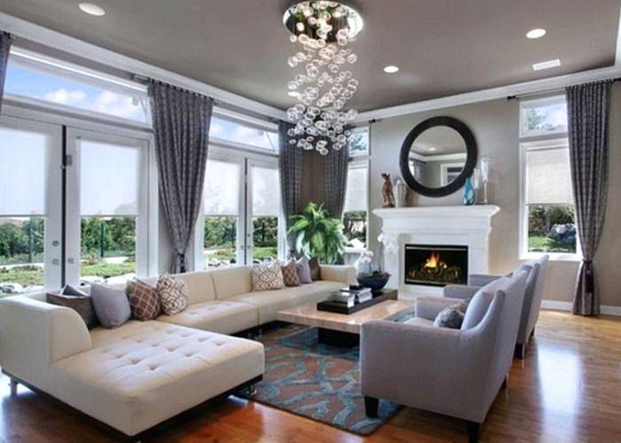 Anda bisa menambahkan sebuah lampu kristal berkilau yang indah. Warna gorden dengan tema yang netral menggunakan sebuah bahan linen atau kayu lapuk halus dengan detail berlapis emas, atau dikenal dengan kesa ala negara barat, akan memberikan high-end glamour vibe pada ruang tamu mewah kamu.Terutama jika ditambah gorden berwarna elegan seperti abu atau emas.