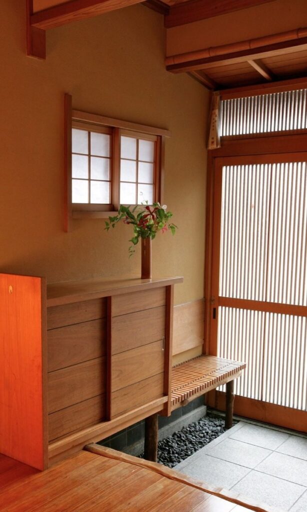 Ini adalah salah satu fitur yang harus dimiliki di rumah Jepang. Terlepas dari jenis bangunannya, area pintu masuk akan selalu ada bahkan di kondominium. Pintu depan adalah pembatas antara bagian dalam dan luar rumah Anda. Digunakan sebagai tempat untuk menyambut tamu dan melepas sandal serta mengganti sepatu sebelum memasuki ruang tatami. Foyer yang memiliki fungsi foyer mirip dengan lobby biasanya dilengkapi dengan rak atau lemari yang disebut getakata untuk menyimpan sepatu dan ornamen lainnya.